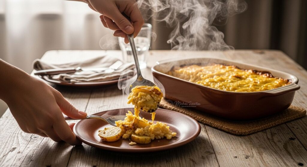 Experimente servi-lo com uma salada de folhas verdes frescas, temperada com azeite, limão e sal. A crocância e acidez da salada contrastam perfeitamente com a cremosidade do escondidinho.