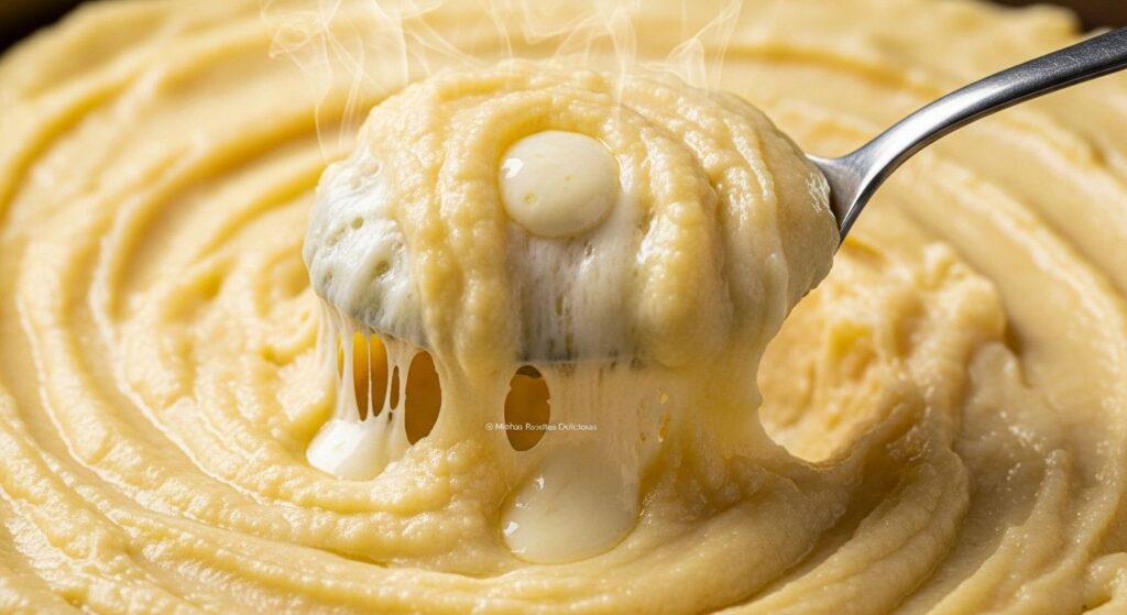 - Adicione os cremosos: Leve a panela com o purê amassado de volta ao fogo baixo. Adicione a manteiga e mexa bem até derreter e incorporar.